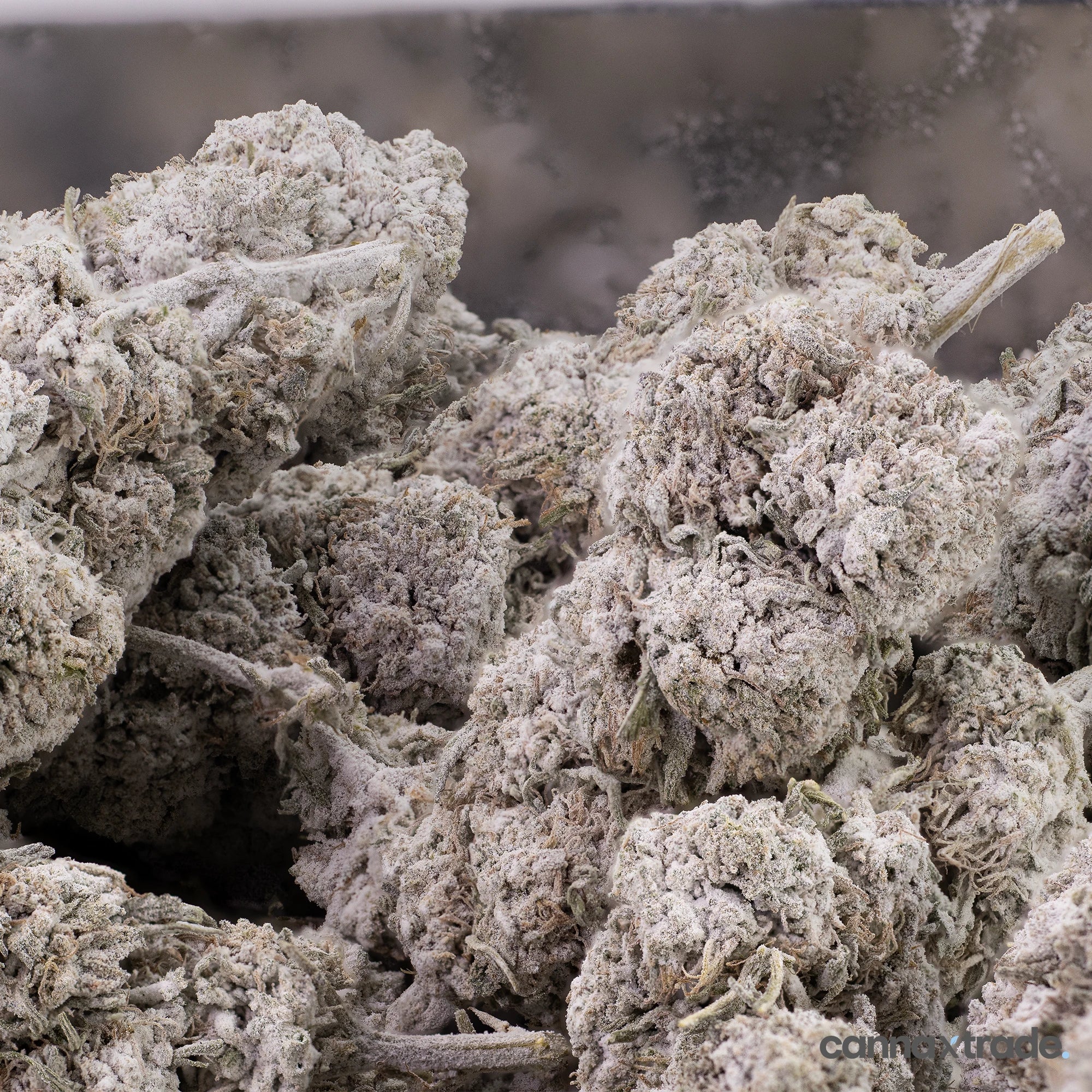 Diesel 25 is a THCA-coated, medium-dense bud with a rugged, layered structure and a pale lavender-grey coloration. The flower is heavily frosted with crystalline THCA, giving it a powdery, snow-covered appearance, while its twisted bracts and subtle muted pistils create a complex, textured finish.