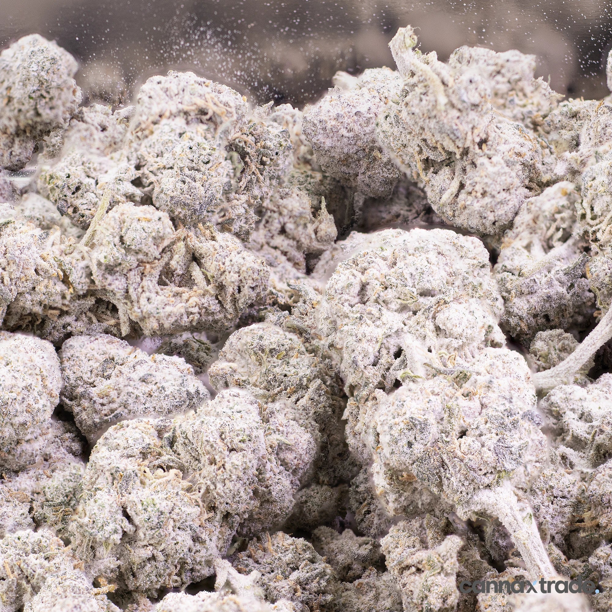 Durban Poison 23 is a THCA-coated flower with a tall, tapered structure and a strikingly frosted exterior. Its surface is layered in fine crystalline THCA, creating a pale, powder-sugar finish that softens the bud’s natural deep greens and subtle purples.